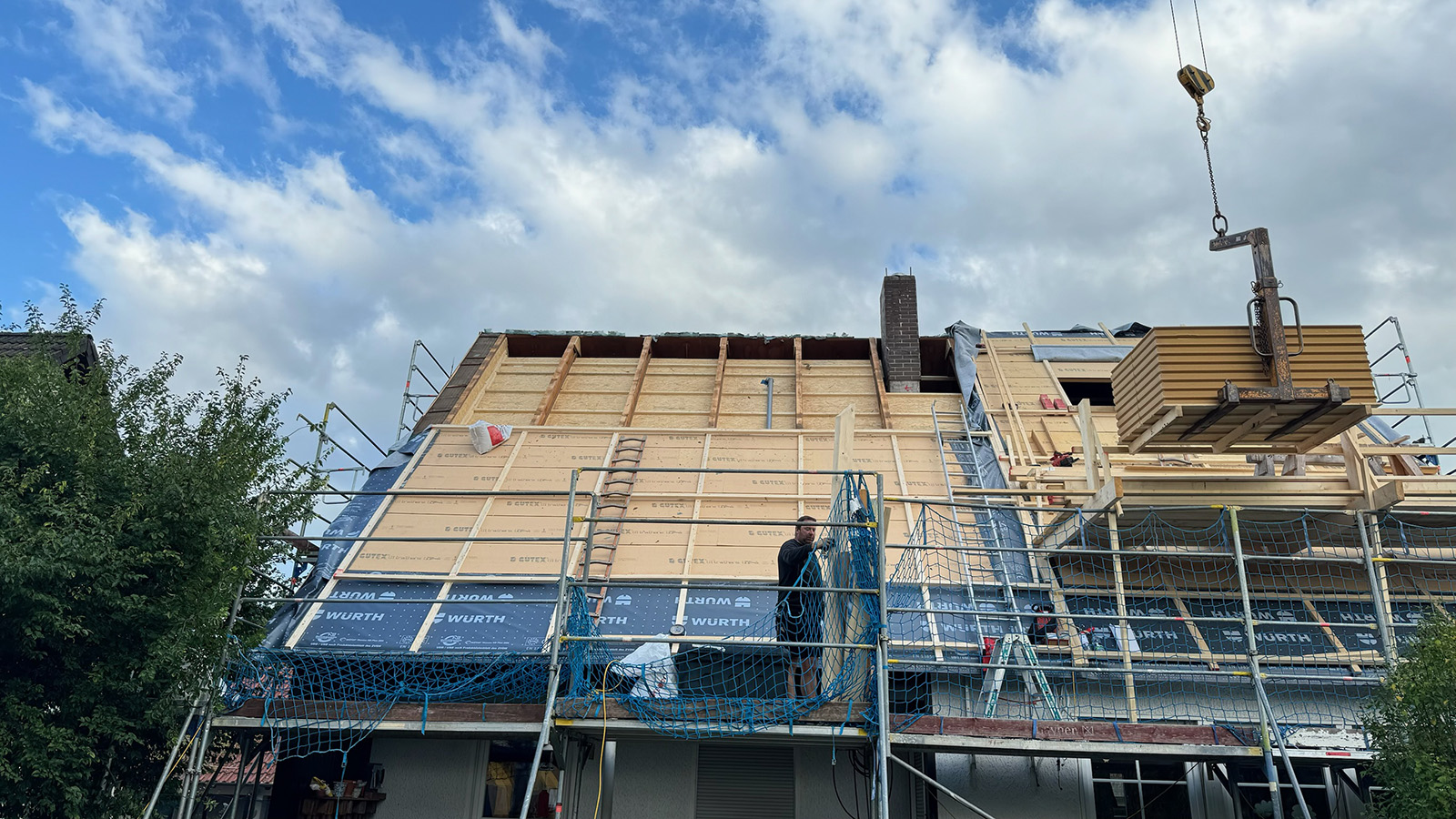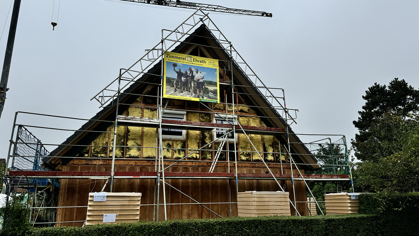 Das Dach wurde komplett neu aufgebaut, gedämmt und eingedeckt, inklusive großzügiger Dachfenster. Damit entstand heller, nutzbarer Wohnraum mit viel Platz für die junge Familie. Die Zimmerei Ehrath unterstützte neben der handwerklichen Umsetzung auch in der Vorplanung.